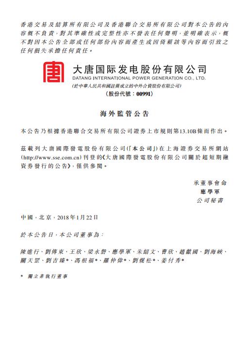 大唐發(fā)電發(fā)布公告,公司已于2018年1月19日完成了“大唐國際發(fā)電股份有限公司2018年度第一期超短期融資券”的發(fā)行。