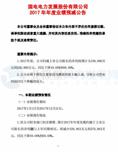 國(guó)電電力預(yù)計(jì)2017年凈利潤(rùn)同比下降22.69億元到27.69億元