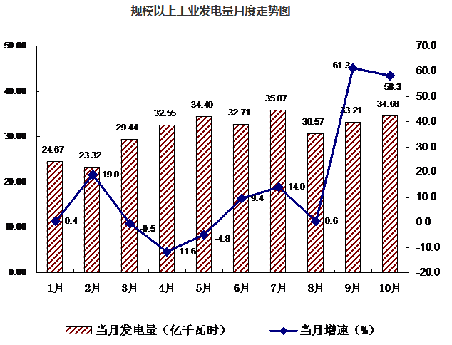 10月份,全盟電力行業(yè)受火電影響,發(fā)電量大幅增長。實現(xiàn)發(fā)電量34.68億千瓦時,較上年同期增加12.77億千瓦時,同比增長58.2%,比9月份回落3.0個百分點。1-10月份,累計完成發(fā)電量313.22億千瓦時,同比增加32.21億元,同比增長11.5%。