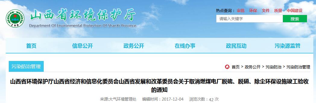 山西:取消燃煤電廠脫硫、脫硝、除塵環(huán)保設施竣工驗收