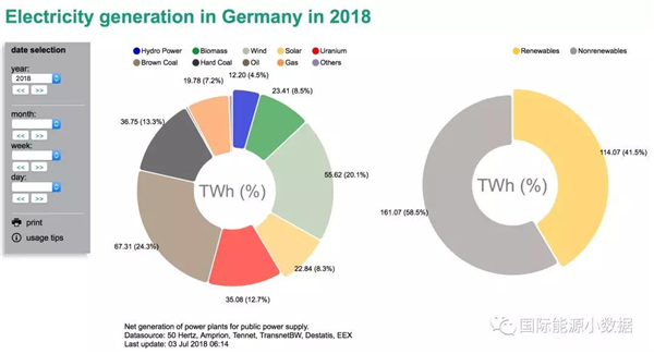 根據(jù)德國ISE研究所的最新數(shù)據(jù),2018年上半年德國發(fā)電總量為113TWh(1130億千瓦時(shí)),可再生能源發(fā)電再創(chuàng)新高,比例達(dá)到41 5%(風(fēng)電20 2%、生物