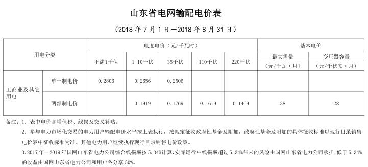 附件:1.山東省電網(wǎng)銷售電價(jià)表、山東省電網(wǎng)輸配電價(jià)表(2018年7月1日-8月31日)