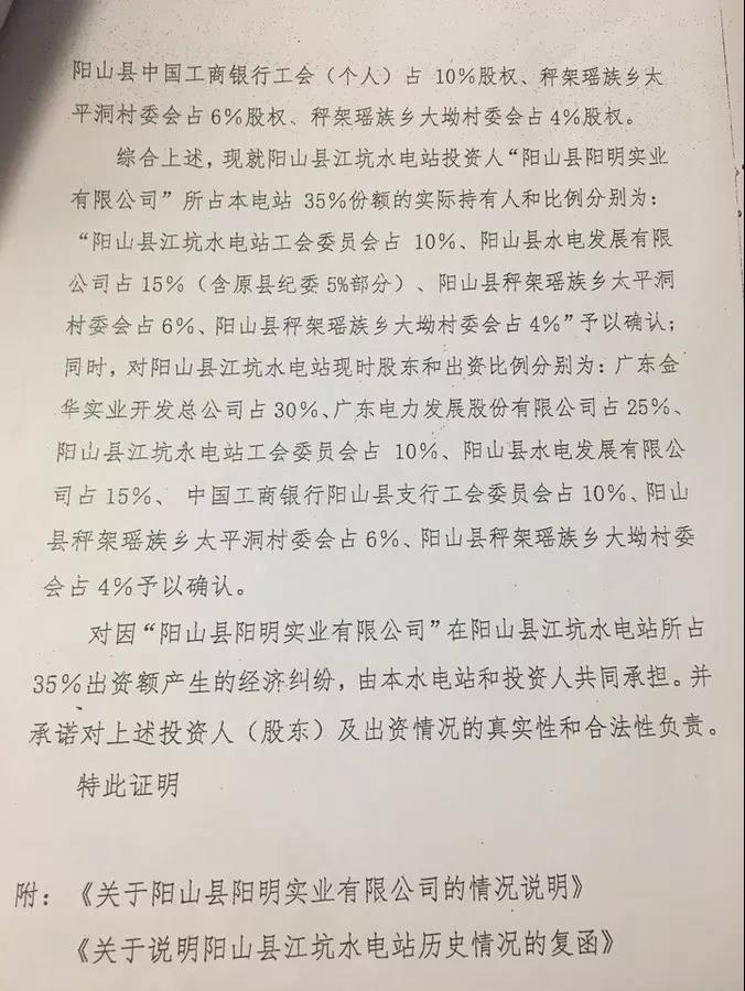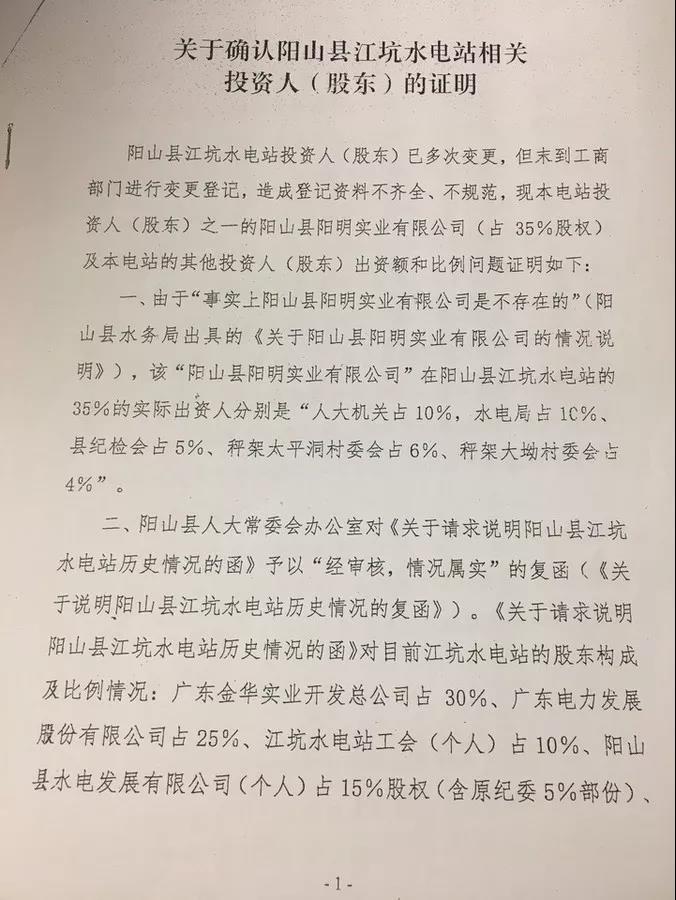 廣東金華實(shí)業(yè)開發(fā)總公司投資陽山縣江坑水電站30%股權(quán)。1994年12月1日,廣東金華實(shí)業(yè)開發(fā)總公司投入江坑水電站初始資金600萬元,1996年分紅擴(kuò)股85.10萬元,2014年和2015年投入增效擴(kuò)容資金206.459158萬元。目前,股份占比30%。