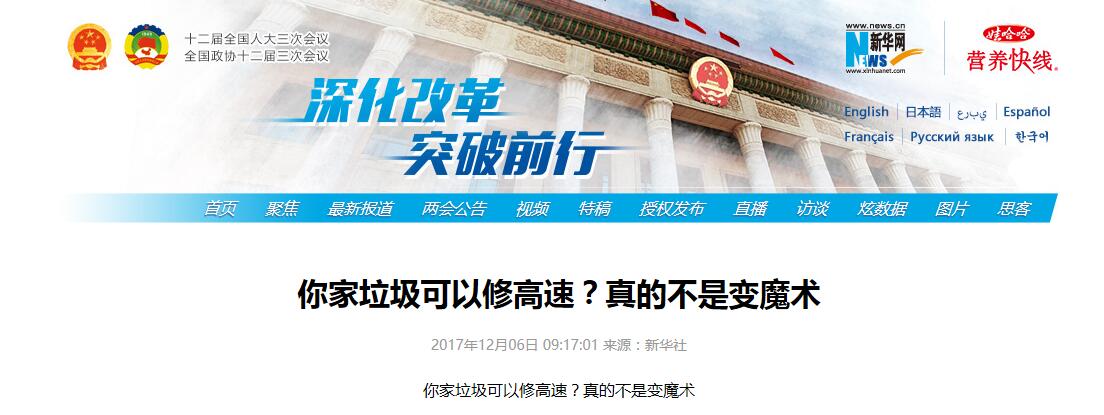 新華網(wǎng)報(bào)道界面松滋水泥項(xiàng)目遠(yuǎn)景皮帶運(yùn)輸系統(tǒng)松滋水泥項(xiàng)目辦公樓外景  12月5日,新華社客戶端,新華社臉書、推特等海外社交媒體同步推送報(bào)道《你家垃圾可以修高速?真的不是變魔術(shù)》,全面展示了中國能建葛洲壩