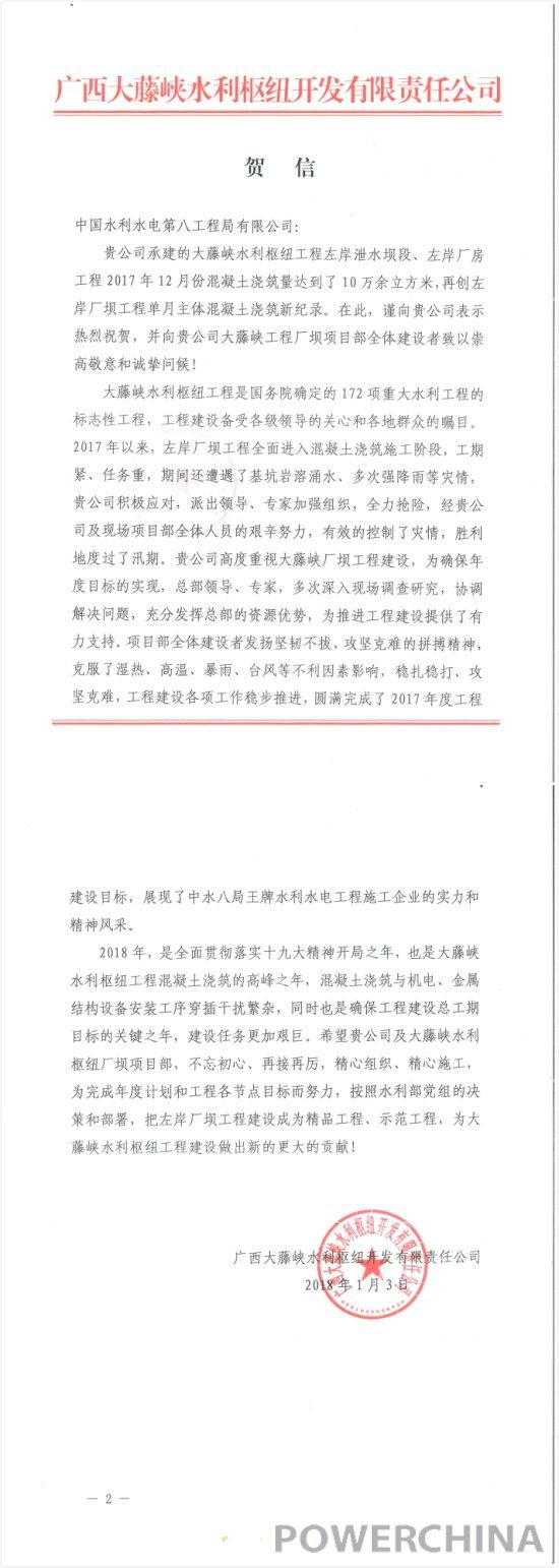 中國電建大藤峽項目2017年完美履約 獲業(yè)主賀信