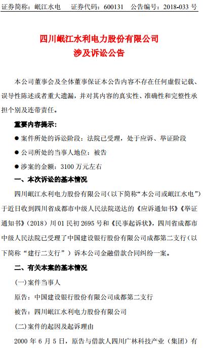 涉資3100 萬(wàn)元!岷江水電涉及訴訟公告