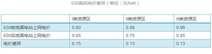 也就是說(shuō),“630”前后,I、II、III類資源區(qū)光伏電站(地面電站、全額上網(wǎng)的分布式)上網(wǎng)電價(jià)分別差0.15元、0.13元、0.13元。以I類資源區(qū)舉例,補(bǔ)貼下調(diào)幅度高達(dá)23%。