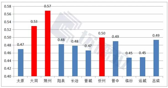 根據(jù)上述圖表,可知,太原、陽泉、長治、晉城、晉中、臨汾、運(yùn)城、呂梁均屬于中等級別。大同、朔州、忻州屬于高級別。