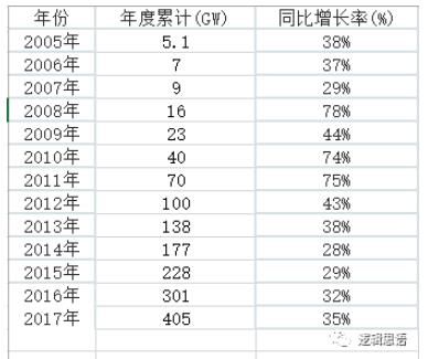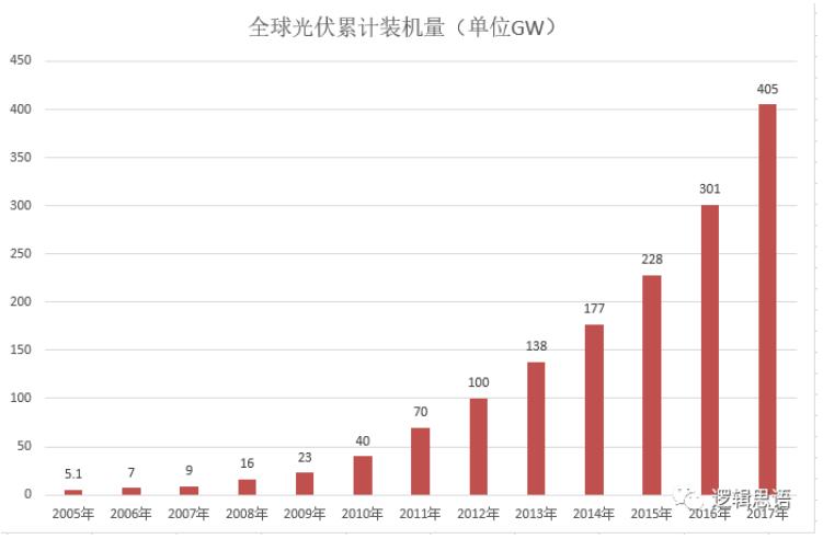我們來看一組數(shù)據(jù),這是全球光伏裝機容量從2005年到2017年的累計裝機量統(tǒng)計。
