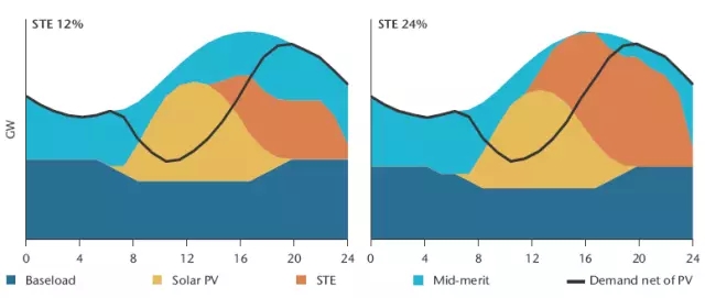 在下午和傍晚為用電高峰的國家,最大比重可能面向光伏。然而在部署光伏以后,當晚上高峰增加時光伏的負荷曲線變得更有利于太陽能熱發(fā)電。太陽能熱發(fā)電能夠很好地對這些變化作出響應(圖2)。關鍵點在于太陽能熱發(fā)電站根據高峰和中峰需求發(fā)電;日落后,其容量補充當天早些時候的光伏發(fā)電量。