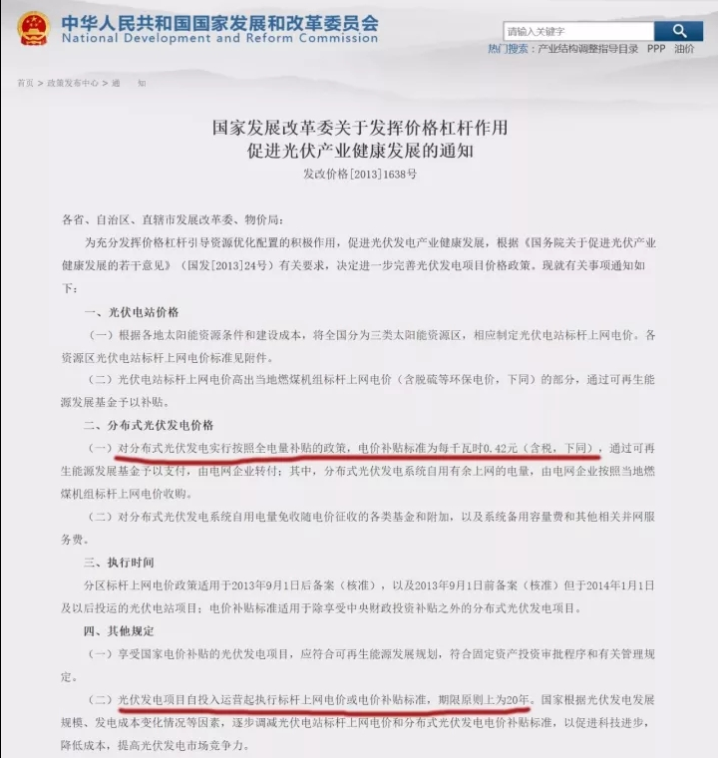 記者查閱國(guó)家發(fā)改委文件:分布式光伏補(bǔ)貼標(biāo)準(zhǔn)為20年。在目前未執(zhí)行調(diào)價(jià)之前安裝的光伏項(xiàng)目將享受0.42元/度補(bǔ)貼。