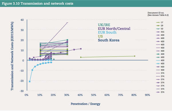 第三項要考慮的系統(tǒng)成本因素是因為吸納間歇性可再生能源電網(wǎng)所需要的“加固”和“靈活性”改造,此項成本約在5-20英鎊/兆瓦時(合人民幣0.04-0.17元/千瓦時)。越是不靈活的電網(wǎng),改造成本就越高。但是由于電網(wǎng)本身需要不斷的技術(shù)改造,并和周邊地區(qū)或國家聯(lián)網(wǎng),所以電網(wǎng)改造的成本并不應(yīng)該全部算在可再生能源頭上。