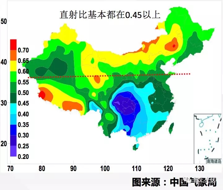 從中國氣象局公布的這張圖上來看,就是剛才說三十六點(diǎn)五度附近他的直射比非常理想。在這種緯度分布疊加雙面跟蹤軸技術(shù)對(duì)發(fā)電量提升效果是非常顯著的。