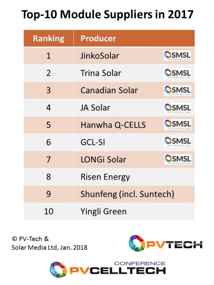 PV-Tech表示,2017年的十大供應(yīng)商總出貨量達到57吉瓦,其中七家來自硅基組件超級聯(lián)盟SMSL,并占據(jù)榜單的前七位,分別是晶科能源、天合光能、阿特斯太陽能Canadian Solar、晶澳太陽能、韓華集團Hanwha Q-CELLS、協(xié)鑫集成、隆基太陽能LONGi Solar。排在第八至第十位的分別是東方日升、順風(fēng)光電、英利綠色能源。