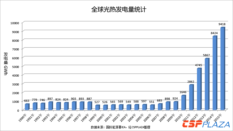 光熱發(fā)電自1980年代邁入商業(yè)化進(jìn)程已30多年,其在全球電力供應(yīng)結(jié)構(gòu)中的地位逐步提升,從1990年到2015年,全球光熱發(fā)電的總發(fā)電量由663GWh增加到9418GWh,增幅1320%。