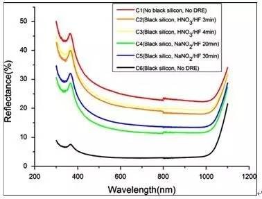 圖2是六個不同條件的黑硅表面形貌。C2到C6硅片表面納米小山峰的密度和高度都不一樣。C1是酸制絨硅,表面沒有納米級結(jié)構(gòu)。C6是原始的黑硅,沒有做缺陷消除處理,表面小山峰的密度和高度都比較大。納米結(jié)構(gòu)是刻蝕離子、掩膜相互競爭形成的??梢园l(fā)現(xiàn)C5到C2小山峰的密度和高度不斷降低。消除缺陷的化學(xué)反應(yīng)分兩步完成。首先,硅片表面被HNO3或者NaNO2氧化,在硅片表面產(chǎn)生氧化層。然后氧化層被HF刻蝕掉,導(dǎo)致小山峰的密度和高度都降低。C2、C3條件黑硅表面的小山峰濃度和高度比C4、C5低。這是因?yàn)镠NO3比NaNO2的氧化能力強(qiáng)。不管是那種刻蝕溶液,反應(yīng)時間越長,小山峰的密度和高度越低。