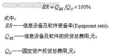 需要說明的是對于某些規(guī)模較大的企業(yè),可以在此基礎上增加單項設備及軟件的裝備率指標作為補充。單項設備及軟件的裝備率為該信息設備及軟件的投資費用與信息設備及軟件的投資總費用之比。