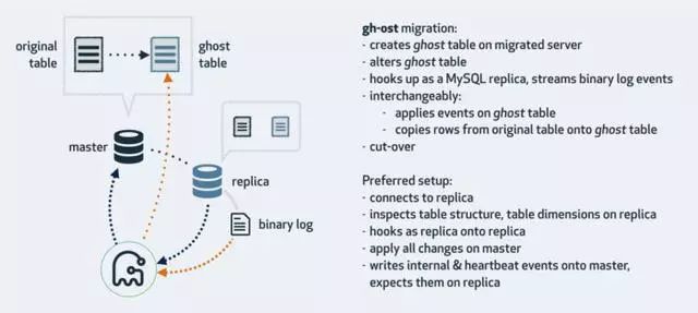 那么 Gh-ost 如何工作呢?默認(rèn)情況下,Gh-ost 連接到副本(從),標(biāo)識主節(jié)點,并在主節(jié)點上進(jìn)行應(yīng)用遷移。它將副本上的更改接收到 binlog_format = ROW 的源表中,解析日志并將這些語句轉(zhuǎn)換為在主 shadow 表上重新執(zhí)行。它跟蹤副本上的行數(shù),并確定何時執(zhí)行原子切換(切換表)。