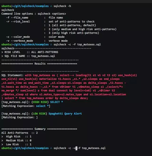 Sqlcheck 可以針對不同的風(fēng)險分為低風(fēng)險,中風(fēng)險或高風(fēng)險三大級別。如果反模式列表很大,這會很有幫助,因為可以優(yōu)先考慮對性能影響最大的查詢。要做的是收集一個不同的查詢列表到文件,然后將它們作為參數(shù)傳遞給該工具。