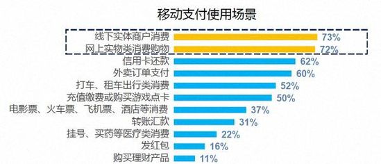在移動支付的使用場景中,商超及餐飲類線下實體消費、網(wǎng)上實物類消費比例最高。