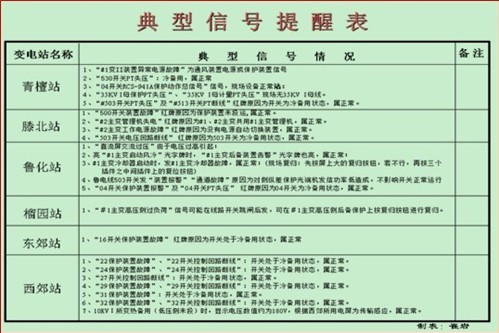 2.2 典型信號(hào)提醒表:此類信號(hào)并不是設(shè)備異常信息,但在工作中會(huì)時(shí)不時(shí)的發(fā)出,在判斷上容易產(chǎn)生誤導(dǎo),為了避免不必要的精力支出,我們將這類信號(hào)匯總提醒值班員。例如:220KV開(kāi)關(guān)收發(fā)信機(jī)動(dòng)作信號(hào)、備用開(kāi)關(guān)的異常信號(hào)等都可以通過(guò)此表來(lái)排除,加強(qiáng)設(shè)備巡視與監(jiān)控質(zhì)量。