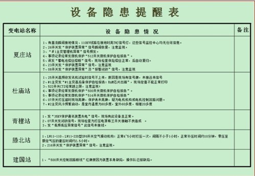 2.1 設(shè)備隱患提醒表:匯總變電站存在的異常信號(hào),且在短時(shí)間內(nèi)無(wú)法處理的隱患(例如:滕北站發(fā)“216開(kāi)關(guān)保護(hù)裝置異常”發(fā)后隨即復(fù)歸,檢修部門無(wú)法捕捉檢查)。監(jiān)控值班員在監(jiān)控過(guò)程中,可以通過(guò)此表跟蹤并加強(qiáng)監(jiān)視,及時(shí)匯報(bào),提高值班員的判斷能力。