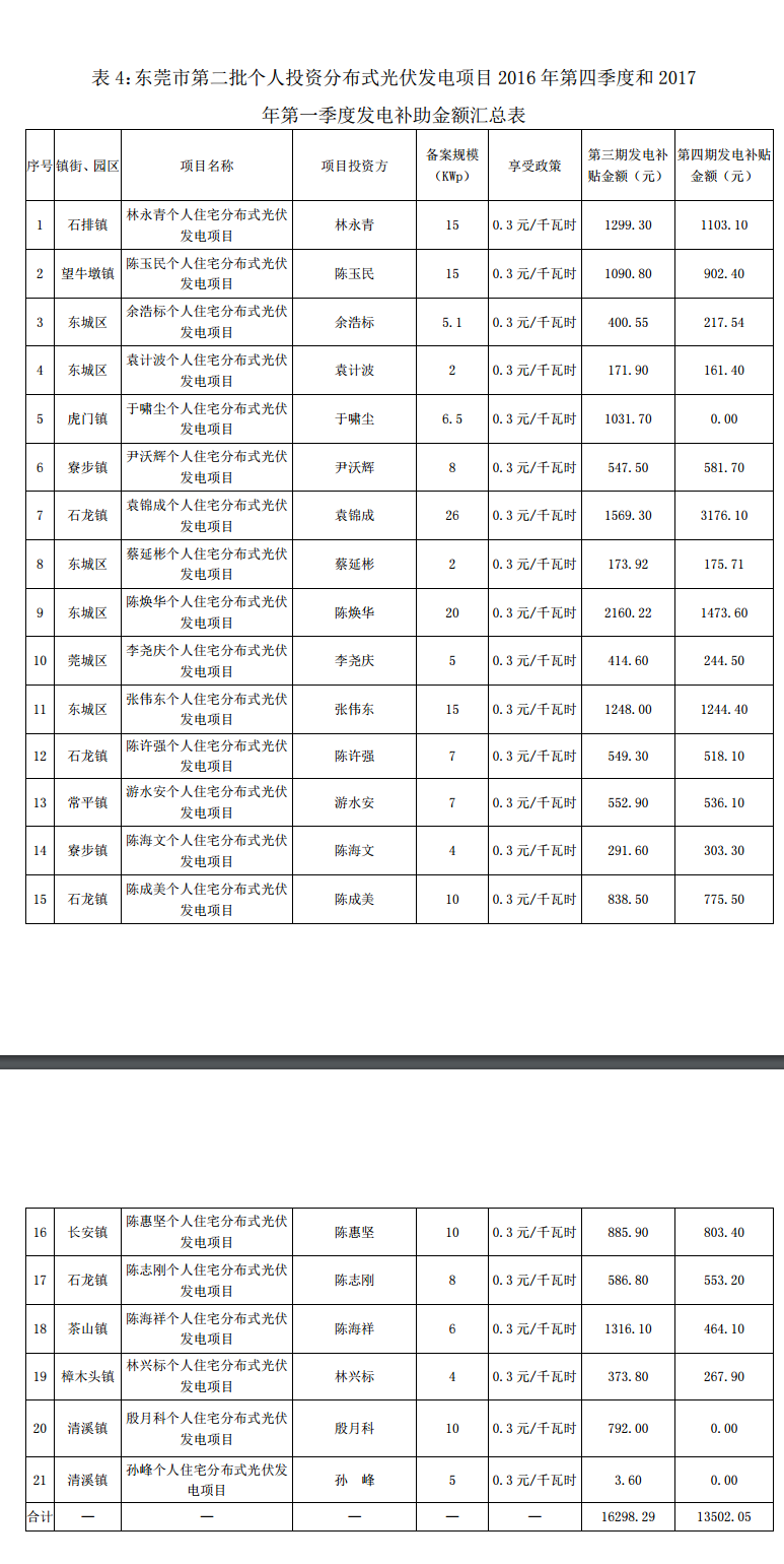 廣東東莞市前四批分布式光伏項(xiàng)目補(bǔ)助名單(2016-2017Q1)