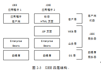 J2EE使用多層的分布式應(yīng)用模型,能夠?yàn)椴煌姆?wù)提供獨(dú)立的層:客戶層(client tier)在客戶端機(jī)器上運(yùn)行,包括Html頁面,客戶端應(yīng)用程序支持HTTP協(xié)議;Web層(WEB tier)在J2EE應(yīng)用服務(wù)器上運(yùn)行,Web層組件主要指Jsp,Java servlet等WEB部件;業(yè)務(wù)層也稱為企業(yè)組件層,在J2EE應(yīng)用服務(wù)器上由EJB容器運(yùn)行,支持EJB、JMS、JTA 等服務(wù)和技術(shù),因此也叫EJB tier;企業(yè)信息系統(tǒng)層(EIS tier),EIS的數(shù)據(jù)層主要特點(diǎn)是有數(shù)據(jù)庫的支持,它在EIS服務(wù)器上運(yùn)行,處理企業(yè)信息系統(tǒng)軟件。J2EE典型四層結(jié)構(gòu),如圖2-3所示: