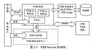 WEB Services是SOA的實(shí)現(xiàn)平臺(tái)。SOA服務(wù)的主要表現(xiàn)形式是WEB services即WEB服務(wù), Web Services采用對(duì)象/組件技術(shù)、使用標(biāo)準(zhǔn)的Internet協(xié)議,具有比任何現(xiàn)有的對(duì)象技術(shù)更好的開放性。目前,WEB服務(wù)己成為SOA的主要技術(shù)。WEB services的描述語言WSDL,發(fā)現(xiàn)和集成協(xié)議UDDI,簡單對(duì)象訪問協(xié)議SOAP,構(gòu)成了WEB services最基本的技術(shù)規(guī)范。WEB services的運(yùn)行方式與SOA的設(shè)計(jì)思想也是基本類似的,WEB Services的結(jié)構(gòu),見圖2-2。