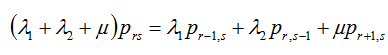 圖1中所體現(xiàn)出來的優(yōu)先制度為:當(dāng)r>0時(shí),(r,s+1)狀態(tài)不能轉(zhuǎn)移到(r,s)狀態(tài),因?yàn)橐坏┯芯€路空閑,A隊(duì)就會(huì)占用線路,就轉(zhuǎn)移到(r-1,s+1)狀態(tài)。由圖1可寫出穩(wěn)態(tài)下的系統(tǒng)狀態(tài)方程: