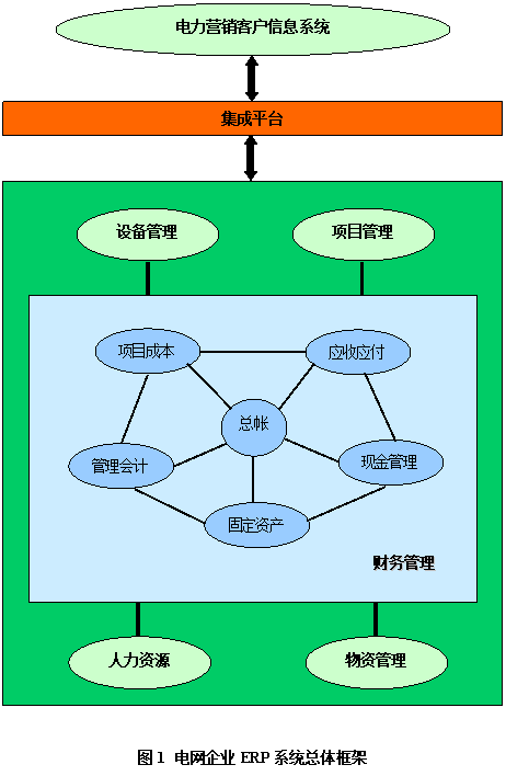 下業(yè)務(wù)目標(biāo):電網(wǎng)、資金、物資、電能、客戶、供應(yīng)商的集團(tuán)管理;采購(gòu)、檢修、工程、停通電業(yè)務(wù)等實(shí)現(xiàn)集團(tuán)級(jí)的有機(jī)協(xié)同;財(cái)務(wù)、業(yè)務(wù)等數(shù)據(jù)的有機(jī)集成。ERP建設(shè)的重點(diǎn)是:財(cái)務(wù)管理、設(shè)備資產(chǎn)管理、物資管理、項(xiàng)目管理、人力資源管理、銷售管理等。電網(wǎng)企業(yè)ERP系統(tǒng)總體框架見圖1。