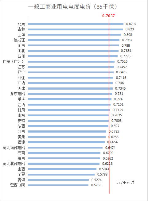 2、35千伏電壓等級(jí)下,全國(guó)平均電價(jià)約為0.5564元/千瓦時(shí),其中,天津最高為0.6585元/千瓦時(shí),青海最低為0.3572元/千瓦時(shí)。