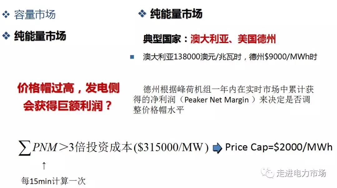 其實他們雖然說設(shè)立的非常高的價格帽,但實際上,像德州,并不會讓市場持續(xù)一直是這么高的價格帽,機(jī)組就可以有特別巨額的利潤。德州每15min計算一個機(jī)組,就是邊際峰荷機(jī)組在一年內(nèi)的凈利潤,有沒有超過一個上限,如果超過的話就會降低價格帽。這樣的話在一定程度上控制了發(fā)電收入。