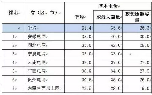 基本電價(jià)只有大工業(yè)用戶(hù)收取,分按最大需量和按變壓器容量收取,深圳供電局輸配電價(jià)未包含基本電價(jià),寧夏電網(wǎng)未包含按變壓器容量收取的價(jià)格,從7省市的基本電價(jià)情況來(lái)看,平均為31.4元/千瓦˙月,按最大需量平均為35.6元/千瓦˙月,按變壓器容量平均為26.3元/千瓦˙月,安徽最高,內(nèi)蒙古西部電網(wǎng)最低,詳情如下: