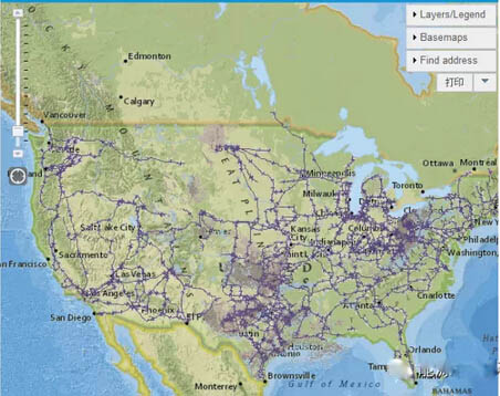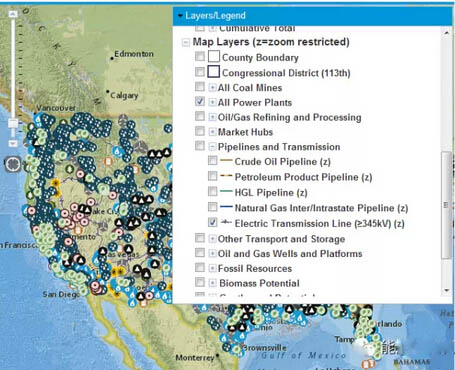 首先映入眼簾的是美國google地圖和電網(wǎng)接線圖(345kV及以上電壓等級),可以放大到很大。之所以展示能源基礎(chǔ)設(shè)施,是因為美國颶風(fēng)比較多,所以要實時預(yù)測天氣環(huán)境對基礎(chǔ)設(shè)施的影響,所以這張圖叫做“實時風(fēng)暴信息下的能源基礎(chǔ)設(shè)施圖”。