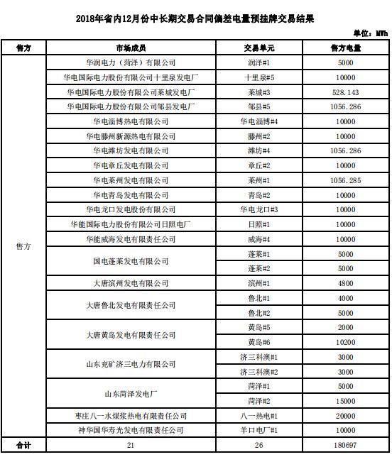 山東2018年12月省內(nèi)中長期交易合同偏差電量預(yù)掛牌交易:交易電量186萬兆瓦時
