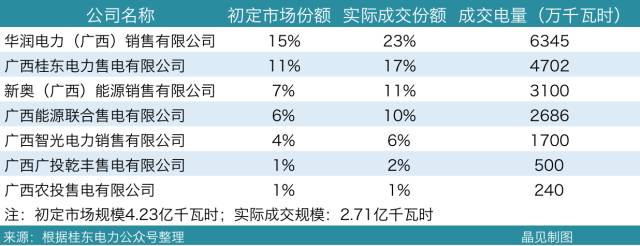 由于最終市場(chǎng)只成交了預(yù)定規(guī)模4.23億千瓦時(shí)的79%,即2.71億千瓦,因此,雖然成交量最大的華潤(rùn)電力(廣西)銷售有限公司按照規(guī)定成交了6345萬千瓦時(shí),但占到了成交市場(chǎng)規(guī)模的23%,具體請(qǐng)看圖示: