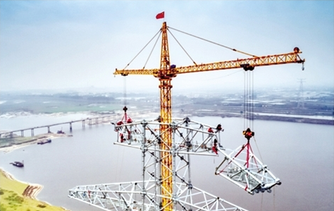 圖為國家電網(wǎng)員工在湖北省浠水縣巴河畔高空吊裝跨河鐵塔。 (資料圖片)
