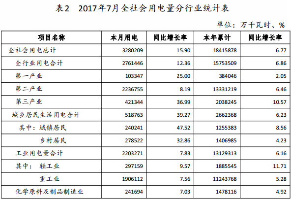 (二)發(fā)電機(jī)組利用小時(shí)情況。截止7月底,全省機(jī)組平均利用小時(shí)數(shù)2119小時(shí),同比減少64小時(shí)。其中水電機(jī)組平均利用小時(shí)數(shù)為1511小時(shí),同比增加48小時(shí);火電為2284小時(shí),同比增加15小時(shí);新能源為845小時(shí),同比減少368小時(shí)。統(tǒng)調(diào)火電機(jī)組平均利用小時(shí)數(shù)為2298小時(shí),同比增加34小時(shí)。(三)發(fā)電裝機(jī)情況。截止7月底,全省裝機(jī)容量7642.19 萬千瓦,同比增加裝機(jī)689.49萬千瓦。其中水電裝機(jī)398.96萬千瓦,占比5.22%,火電裝機(jī)6410.44萬千瓦,占比83.88%,新能源裝機(jī)832.79千瓦,占比10.9%。二、電力消費(fèi)情況(一)全社會(huì)用電量情況。2017年7月,全省全社會(huì)用電量 328.02億千瓦時(shí),同比增長(zhǎng)15.9%;累計(jì)用電量1841.59億千瓦時(shí),同比增長(zhǎng)6.77%。 - 3 - (二)分行業(yè)用電量情況。7月份,第一產(chǎn)業(yè)完成用電量 10.33億千瓦時(shí),同比增長(zhǎng)25%;第二產(chǎn)業(yè)完成用電量223.68億千瓦時(shí),同比增長(zhǎng)8.19%;第三產(chǎn)業(yè)完成用電量42.13億千瓦時(shí),同比增長(zhǎng)36.99%;全省城鄉(xiāng)居民生活用電51.88億千瓦時(shí),同比增長(zhǎng)39.27%。工業(yè)用電量220.33千瓦時(shí),同比增長(zhǎng)7.83%,其中,輕工業(yè)用電量29.72千瓦時(shí),同比增長(zhǎng)9.57%,重工業(yè)用電量 190.61億千瓦時(shí),同比增長(zhǎng)7.56%。 7月份,有色金屬行業(yè)用電量52.75千瓦時(shí),同比增加9.14%。黑色金屬行業(yè)用電量11.68億千瓦時(shí),同比減少3.18%。化學(xué)原料及制品制造行業(yè)用電量24.17億千瓦時(shí),同比增長(zhǎng)7.03%。