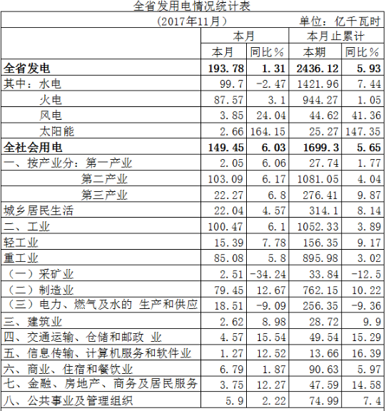 元至11月,全社會(huì)累計(jì)用電1699.30億千瓦時(shí),同比增長(zhǎng)5.65%,其中,第一、二、三產(chǎn)業(yè)用電分別為27.74億千瓦時(shí)、1081.05億千瓦時(shí)、276.41億千瓦時(shí),同比增長(zhǎng)1.77%、4.04%、9.87%;城鄉(xiāng)居民生活用電314.10億千瓦時(shí),同比增長(zhǎng)8.14%。