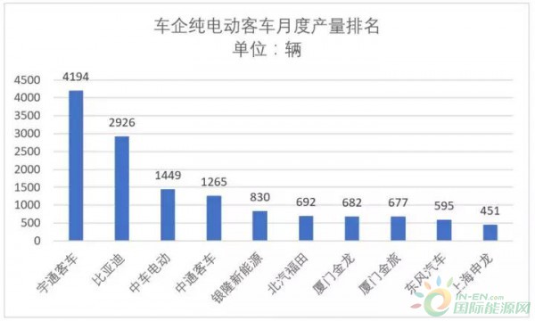 車企方面,就11月產(chǎn)量來說,宇通、比亞迪、中車電動分別以4194輛、2926輛、1449輛排名前三,中通客車以單月產(chǎn)量1265輛排名第四。從單月產(chǎn)量水平看,只有前四強(qiáng)產(chǎn)量過千,銀隆、北汽福田等產(chǎn)量均在千輛以下。