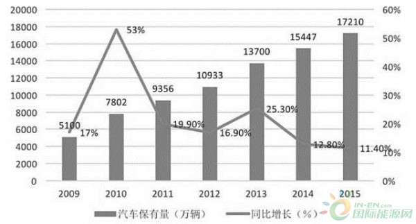 圖 1  2009 ~ 2015 年中國汽車保有量及增量