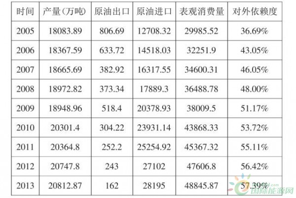 表 1  2005 ~ 2013 年中國原油進(jìn)出口、表觀消費(fèi)量、對(duì)外依存度數(shù)據(jù)