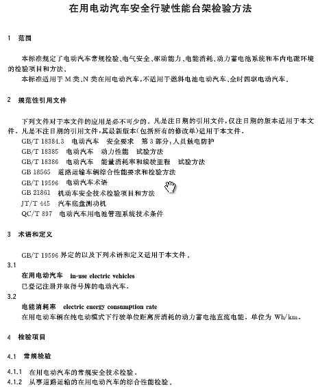 《在用電動(dòng)汽車(chē)安全行駛性能臺(tái)架檢驗(yàn)方法》規(guī)定了電動(dòng)汽車(chē)常規(guī)檢驗(yàn)、電氣安全、驅(qū)動(dòng)能力、電能消耗、動(dòng)力蓄電池系統(tǒng)和車(chē)內(nèi)電磁環(huán)境的檢驗(yàn)項(xiàng)目和方法。該標(biāo)準(zhǔn)適用于M類(lèi)、N類(lèi)在用電動(dòng)汽車(chē),不適用于燃料電池電動(dòng)汽車(chē)、全時(shí)四驅(qū)電動(dòng)汽車(chē)。