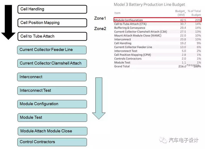 Model 3于2017年12月前周產(chǎn)能均不達(dá)100輛,先前生產(chǎn)瓶頸為電池模組將cell貼至冷卻液管上的前段組裝制程(zone 1-2),現(xiàn)在由人工進(jìn)行,后段( zone 3-5)已全自動化,并已重新設(shè)計前段產(chǎn)線,目前最關(guān)鍵瓶頸已經(jīng)逐步改善,估計未來五個月產(chǎn)能爬升期間僅需處理突發(fā)狀況,逐步達(dá)到原始設(shè)計全線自動化生產(chǎn)后可望大幅提升產(chǎn)能。 Model 3 組裝產(chǎn)線為高度自動化,僅有約5個部件為人工組裝,多數(shù)為較軟的部件如cable等(因機(jī)器人不擅長抓取軟部件)。