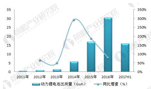 圖表4:2011-2017年國內(nèi)動力鋰電池出貨量變化(單位:Gwh,%)