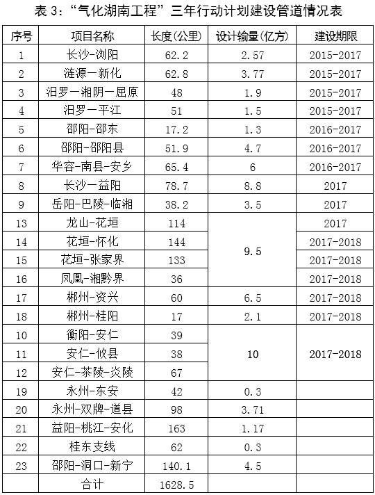 表3:“氣化湖南工程”三年行動計(jì)劃建設(shè)管道情況表