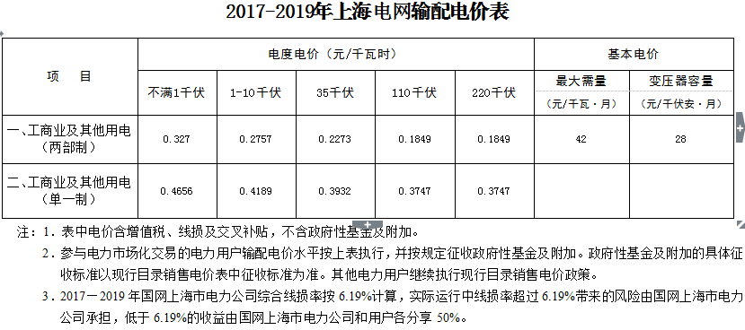 2、2017-2019年上海電網輸配電價表