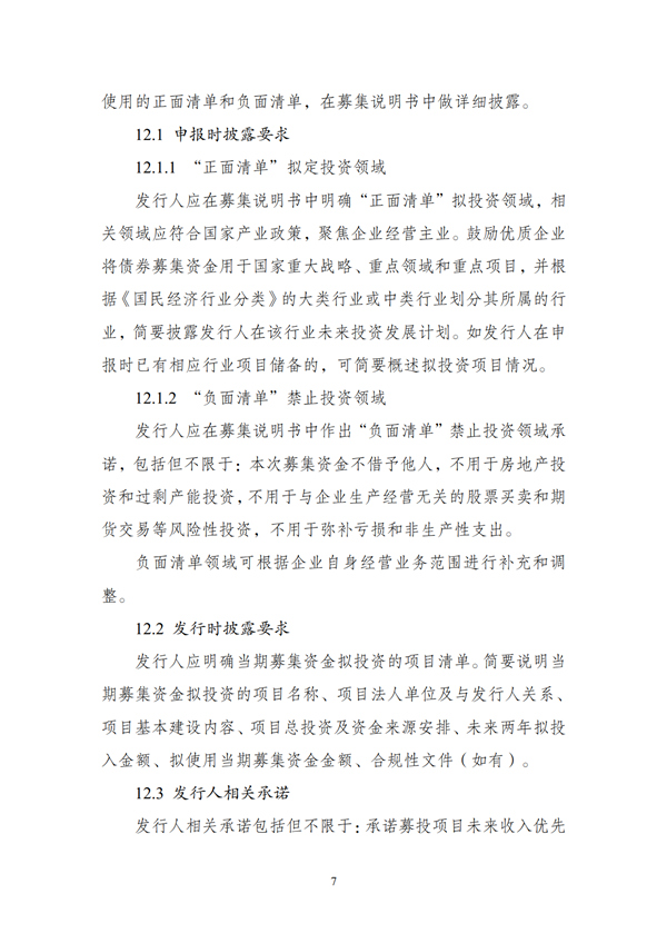(二)申報材料應明確債券募集資金禁止投向領(lǐng)域,形成“負面清單”。“負面清單”包括但不限于:將募集資金借予他人,用于房地產(chǎn)投資和過剩產(chǎn)能投資,用于與企業(yè)生產(chǎn)經(jīng)營無關(guān)的股票買賣和期貨交易等風險性投資,用于彌補虧損和非生產(chǎn)性支出。“負面清單”領(lǐng)域可根據(jù)企業(yè)自身經(jīng)營業(yè)務范圍進行補充和調(diào)整。