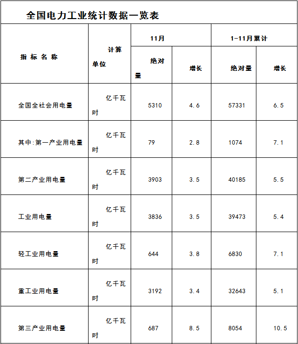 國(guó)家能源局發(fā)布1-11月份全國(guó)電力工業(yè)統(tǒng)計(jì)數(shù)據(jù)